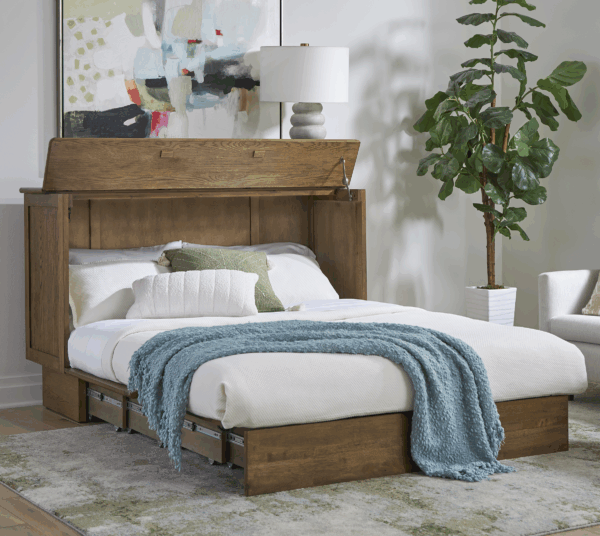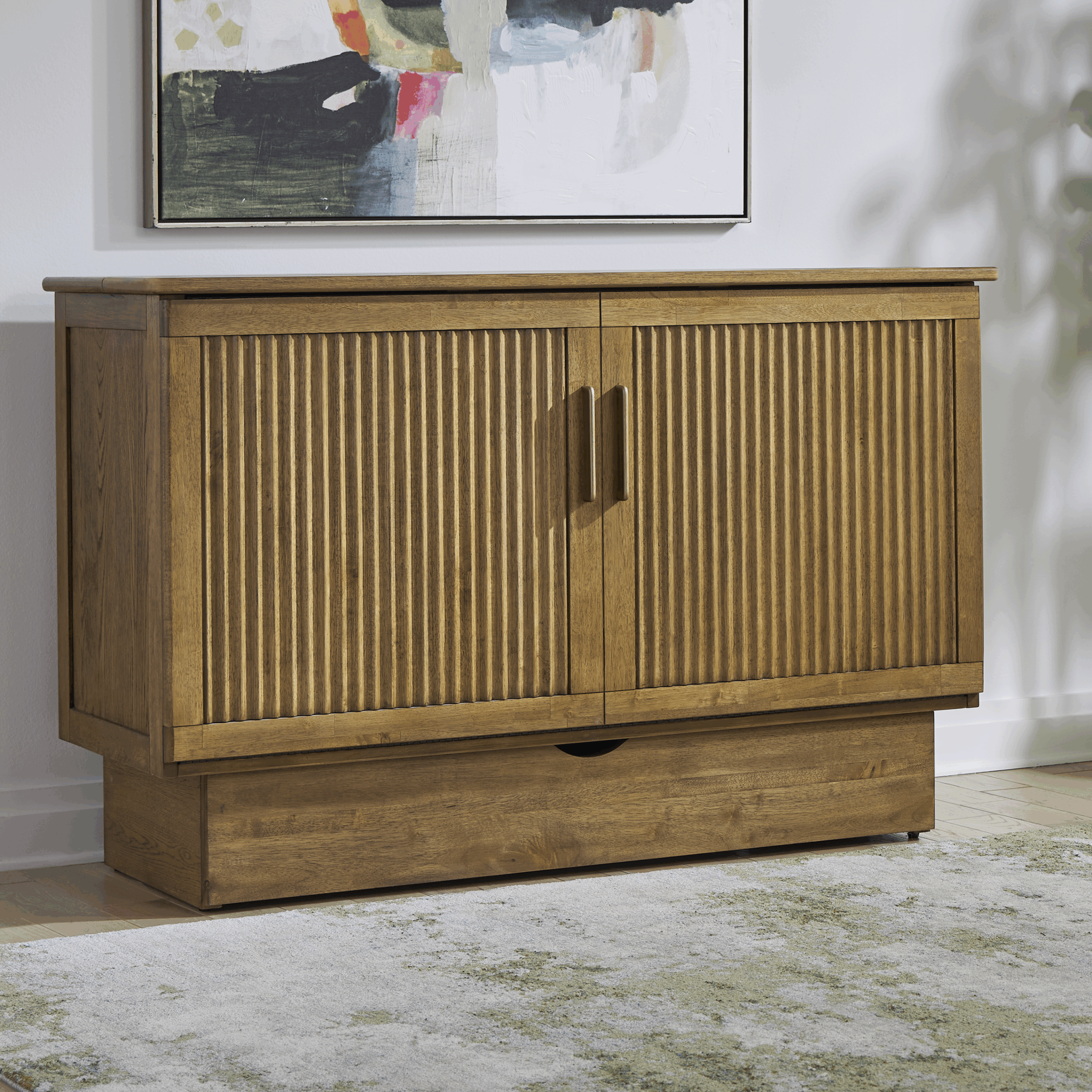 This beautiful cabinet bed comes in the popular reeded style in a warm brown finish that shows natural wood features. A comfortable six-inch mattress is hidden inside. The space saving bed fits almost anywhere taking only 11 square feet of floor space. It is easy to open and close and provides real-bed comfort. It has a roomy storage drawer and a USB port. Constructed of solid wood, plywood and features robust hardware.